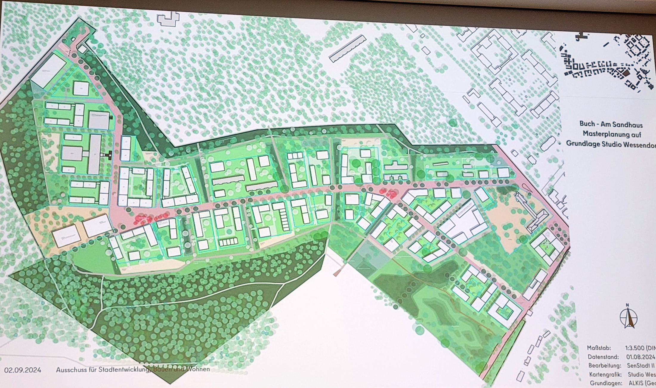 Zur Erinnerung: Die noch aus den 1970er Jahren der DDR stammenden Vorplanungen wurden in den 1990er Jahren wieder aufgegriffen – und wieder verworfen. Seit Anfang 2020 treibt der Senat erneut die Planung voran, vom S-Bahnhof Buch entlang der Straße Am Sandhaus und bis einschließlich des ehemaligen Stasi-Krankenhauses ein »Neues Stadtquartier« zu errichten. Bei ersten Bürgeranhörungen Anfang 2020 bildete sich die Bürgerinitiative »Buch Am Sandhaus«, die 7 grundlegende Forderungen aufstellte…