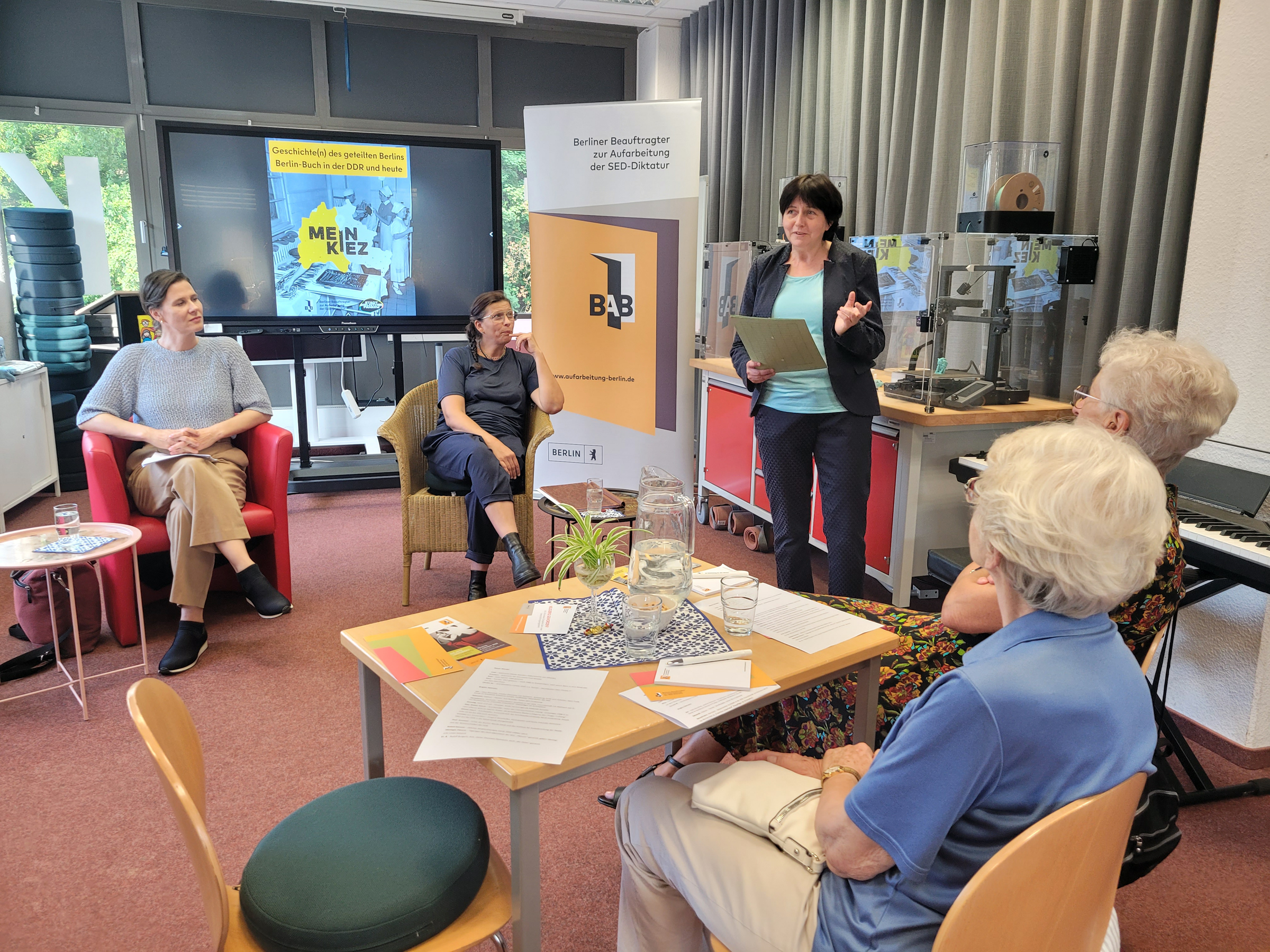 Am 9. September erhoben beide Autorinnen in Buchs Stadtteilbibliothek ihre Stimmen in Inkarnation der Schauspielerinnen Nele Rosetz (Maxie Wander) und Katrin Röver (Brigitte Reimann). Eine bewegende Lesung, Teil eines Dreiklangs – »Berühren, verletzen, verbinden« –, einer Veranstaltungsreihe, die Teile der DDR-Geschichte im Spiegel des Medizinstandorts Buch deutlich machen will. Organisiert wurde sie von Elena Demke von der Berliner Aufarbeitungsstelle der SED-Diktatur. Bibliotheksleiterin Doreen Tiepke-Ihlow begrüßte die knapp 30 Gäste und legte allen ihr Lieblingsbuch »Die Geschwister« von Brigitte Reimann ans Herz.