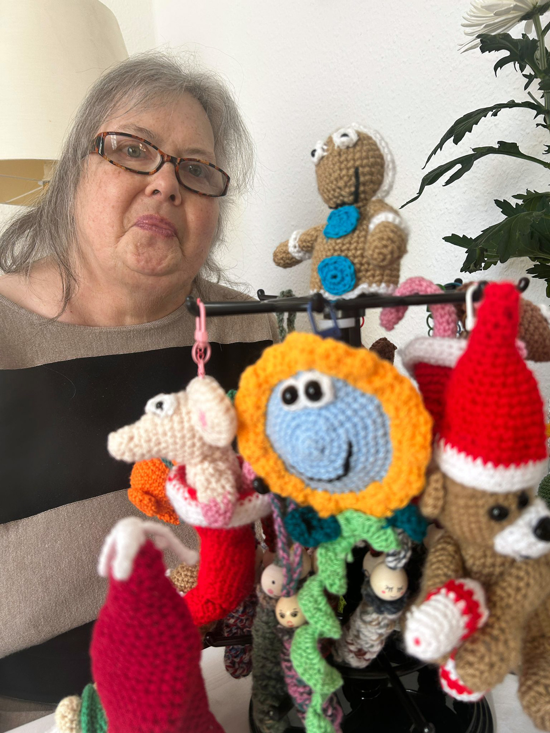 Es war unkompliziert, mit ihr ins Gespräch zu kommen, denn sie spricht sehr gerne über das, was sie bewegt. Mein Interesse galt vor allem ihrem Hobby, dem Häkeln. Sogar auf Facebook ist sie in einer Häkelgruppe aktiv. Das Erste, was aus ihr herausbrach, war der Satz: »Das sind hier alles Engel«. Gemeint waren die Mitarbeiterinnen und Mitarbeiter des Bucher Hospiz’. Deshalb häkelt sie besonders gerne hübsche, kleine Engel. Auch Tiere – wie Elefanten oder einen niedlichen Fuchs, Kürbisse mit lustiger Miene, mit oder ohne Hut, verschiedene Blumen, Pflanzen, viele im gehäkelten Topf, meist mit einem lachenden Gesicht, kleine knuddelige Blumengesichter mit einem fluffigen Stängel, den schon sehr kleine Kinder gut greifen können, sie alle bevölkern das Zimmer in bunter Vielfalt. Eierwärmer je nach Saison als Blumen, Erdbeeren, Kürbisse oder Weihnachtsbäume, ihre Fantasie kennt keine Grenzen. Bei so viel Kreativität ist jede Menge Material vonnöten. Ich habe gestaunt, dass das eigentliche Krankenzimmer eher wie eine kleine Häkelwerkstatt anmutet. Überall Wolle in allen Farben und Stärken, Knöpfe, Schleifen, wo man hinsieht.