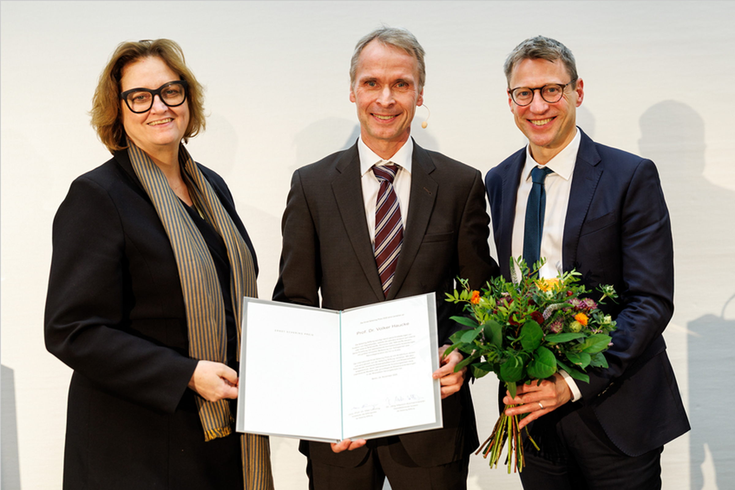 Prof. Dr. Volker Haucke, Direktor des Leibniz-Forschungsinstituts für Molekulare Pharmakologie (FMP) in Berlin-Buch und Prof. für Molekulare Pharmakologie an der FU Berlin, ist mit dem Ernst Schering Preis 2025 ausgezeichnet worden. Ende November 2025 überreichten ihm Wissenschaftssenatorin Dr. Ina Czyborra sowie Prof. Dr. Max Löhning, Vorsitzender des Stiftungsrates der Schering Stiftung den Preis in der Berlin-Brandenburgischen Akademie der Wissenschaften. Der mit 50.000 Euro dotierte Preis geht damit erstmals an einen Wissenschaftler in Berlin!