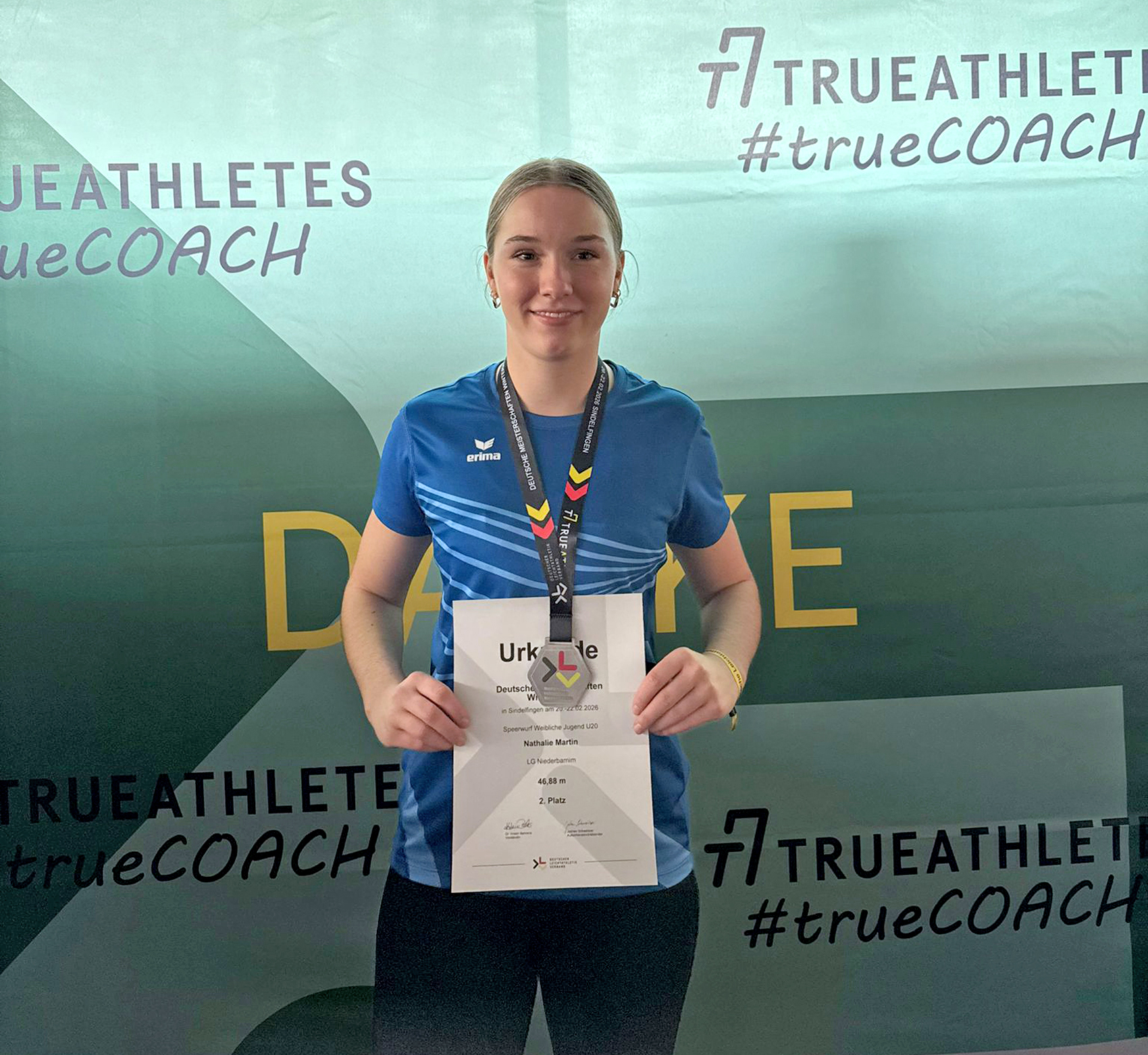 Nathalie reiste mit einer Bestweite von 42,22 m im Speerwurf an. Ein Platz unter den besten 8 war das Ziel. Aber was bereits mit dem ersten Wurf abging, überraschte alle. Nathalie warf gleich auf 46,88 m. Auch eine Konkurrentin traf den Speer gut und setzte sich mit 47,22 m an die Spitze. Aber Nathalie war auf Platz 2! Sie verteidigte den Platz sicher mit weiteren weiten Würfen, obwohl die Bedingungen sich ständig änderten, kam sie richtig gut im Wettkampf klar. Am Ende stand die Silbermedaille für Nathalie fest …